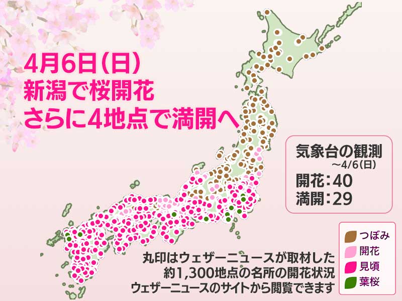 今日の桜開花状況 4月6日(日) 新潟で桜が開花 北陸は開花が進み満開の発表も