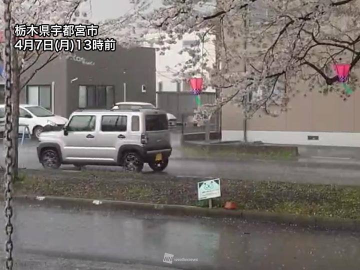 特に異なる方向の風がぶつかることで形成されているシアーラインの周辺で雨雲が発達していて、静岡県から神奈川県、栃木県などは局地的に土砂降りの雨です。活発な雨雲の周辺では雷や霰を伴っている所もあります。