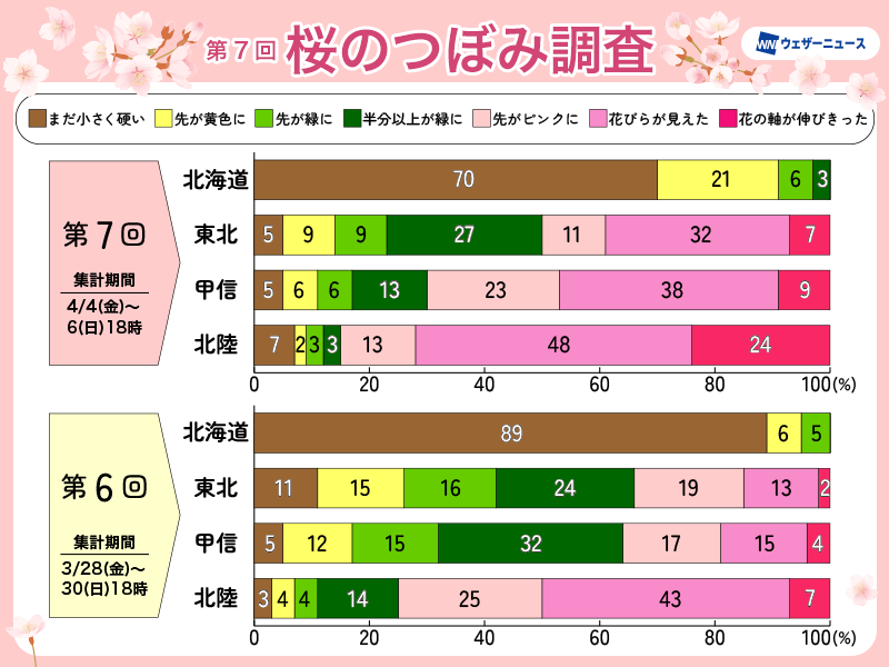つぼみは前回と比較してさらに生長し、甲信や東北では「先がピンクに」以上が50%を超え、開花を迎えたつぼみもあります。北陸では「花の軸が伸びきった」つぼみが24%あり、開花間際のつぼみが多くなっているようです。