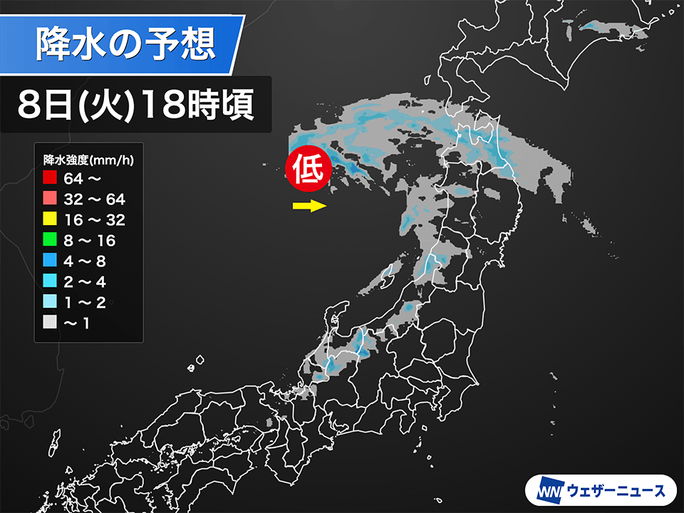 上空に寒気を伴った低気圧が、今日8日(火)の夜に東北地方を通過する予想です。東北や北陸ではだんだんと雲が厚くなり、早いところでは昼過ぎから雨が降り出します。夕方から夜にかけては東北や北陸の各地で天気が崩れる見込みです。