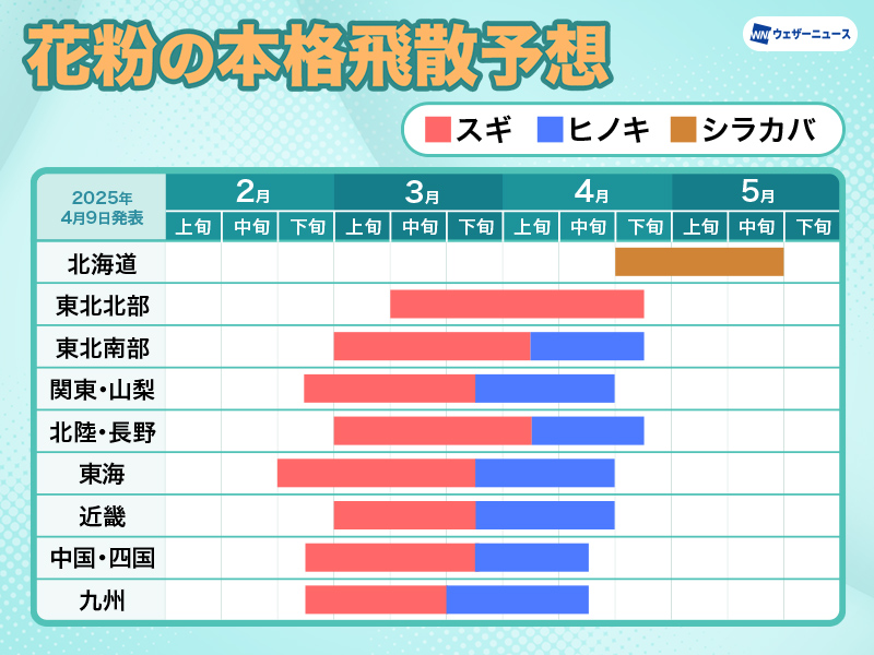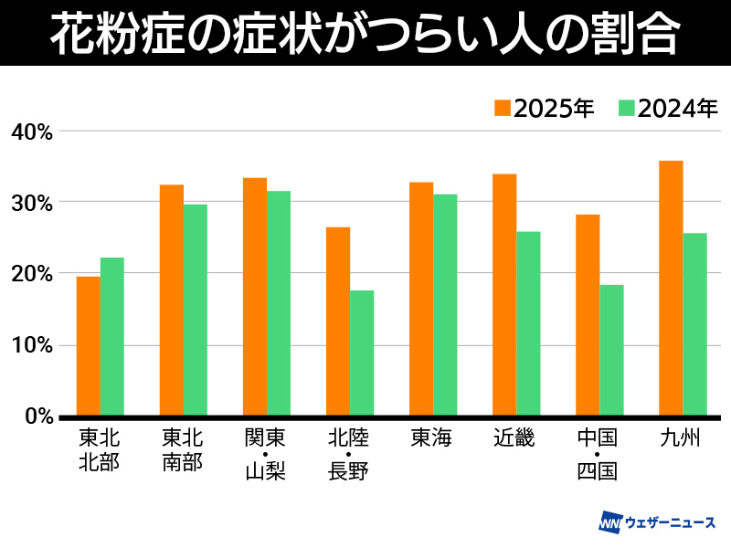 九州から関東でヒノキ花粉の飛散が増加…