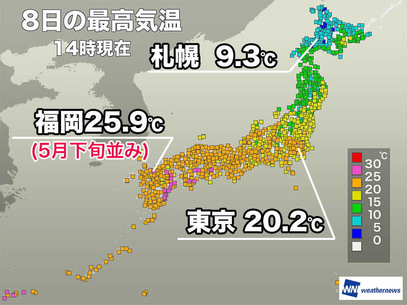今日8日(火)14時までの最高気温は、東京20.2℃、名古屋21.7℃、大阪21.4℃、広島23.4℃でした。関東から西の各地は20℃以上のところが多く、4月下旬から5月上旬くらいの暖かさです。