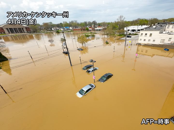 前線に近いケンタッキー州やテネシー州、アリゾナ州を中心に雨量が増加し、6日(日)朝までの96時間の雨量はケンタッキー州・ベントンで380mmに達しています。そのほか、テネシー州・メンフィスで315mm、アリゾナ州・リトルロックで300mmを観測しました。