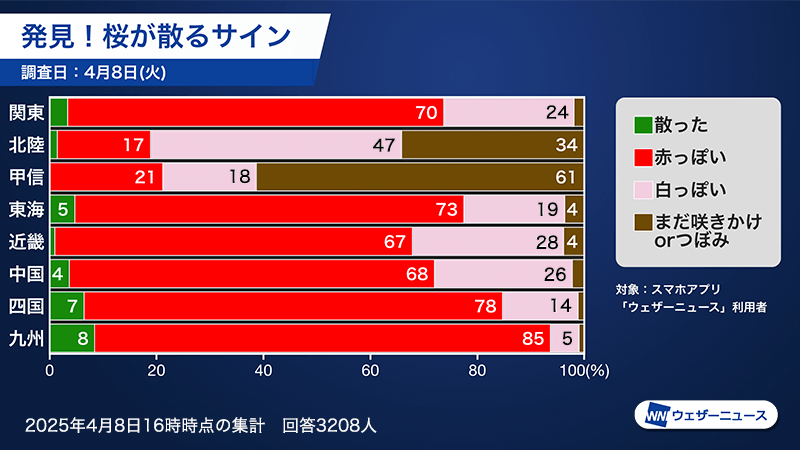 桜(ソメイヨシノ)は桜の花の中心部分が赤っぽくなると「散るサイン」と言われています。ウェザーニュースアプリユーザー対象に行っている調査によると九州から関東では各地域とも70%前後が「赤っぽい」と回答しており、散る時期が近づいていることが分かります。
