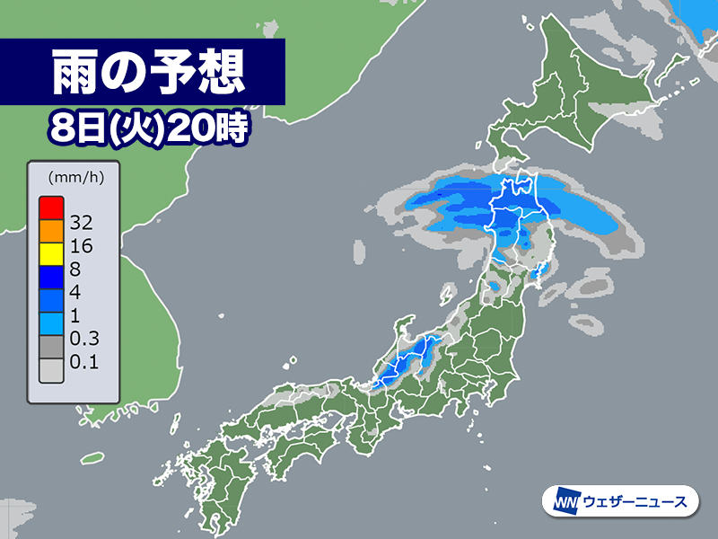 今日8日(火)は午後になって東北日本海側や北陸から山陰に雨雲が広がってきました。