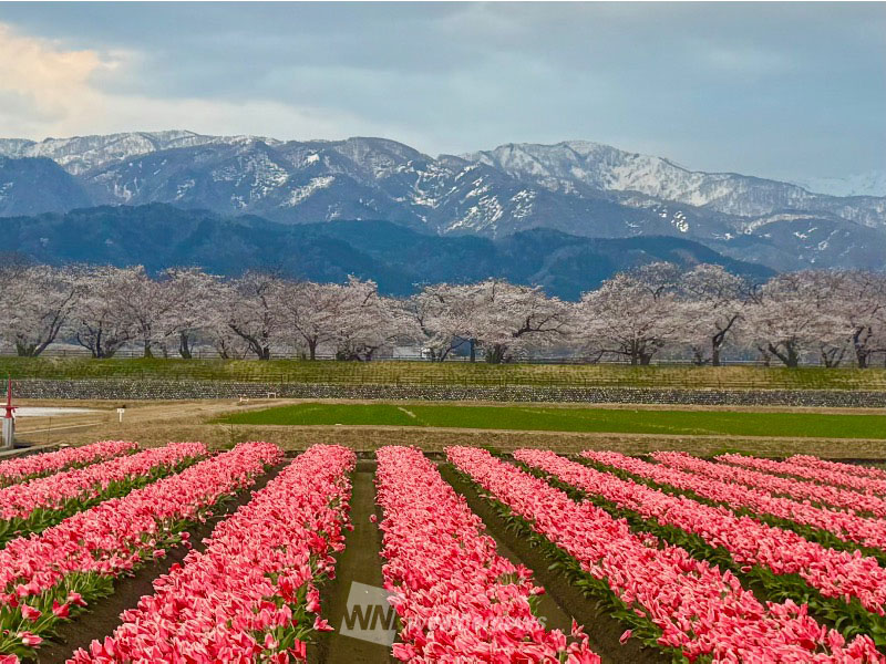 残雪の朝日岳、白馬岳を中心とした北アルプス連峰を背景に舟川の両岸に約280本のソメイヨシノが咲き誇ります。周辺のチューリップ畑、菜の花畑と開花の時期がかさなれば自然がつくりだすみごとな春の四重奏が楽しめます。