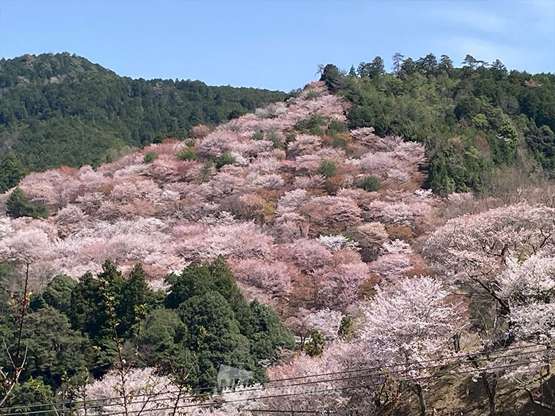 吉野山の谷から尾根を埋める桜はおよそ3万本です。標高の低い下千本から中千本、上千本、奥千本へと花期をずらして咲きのぼる様子は壮観です。