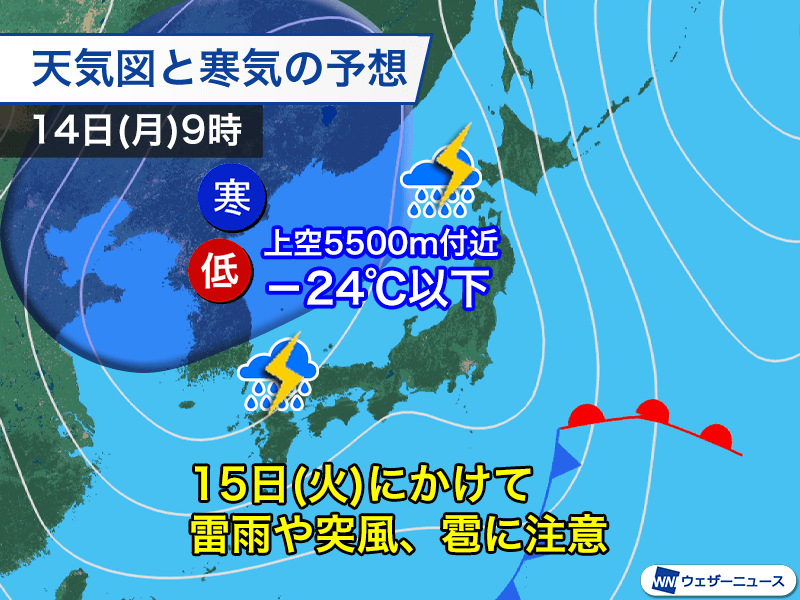 14日(月)には前線は本州から離れますが、日本海に「寒冷渦」と呼ばれる上空に寒気を伴った低気圧が進んできます。
