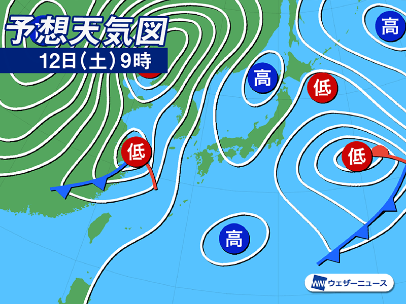 明日12日(土)は低気圧や前線の接近に伴い西から天気は下り坂です。九州など早い所では夕方から雨が降り出します。関東や東海など東日本と北海道は高気圧に覆われて、晴天が続く見込みです。