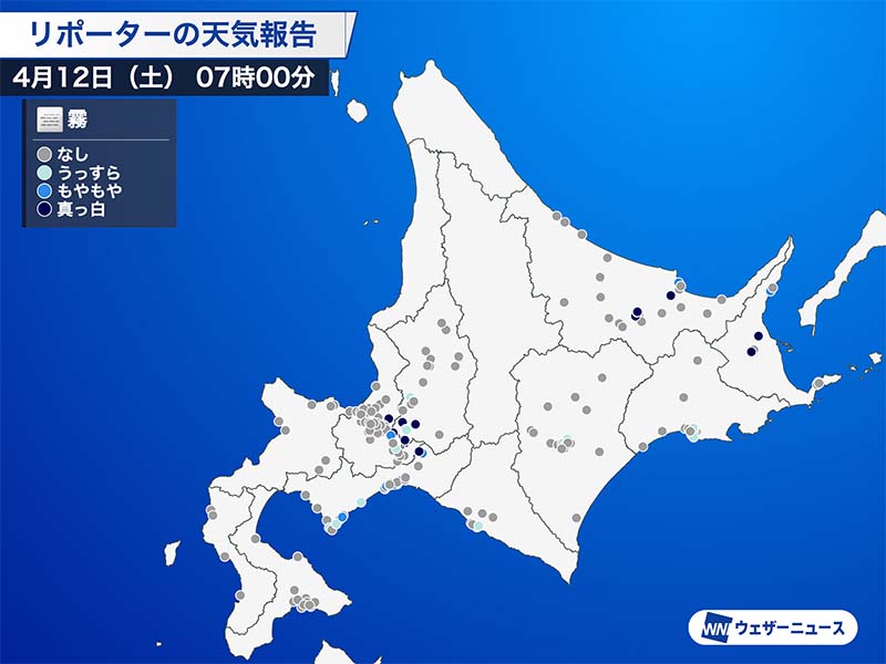 ウェザーニュースアプリのユーザーからの霧の投稿を見ると、道央の石狩南部や南空知、道南の胆振地方、道東の北見周辺など、道内各地から濃い霧の報告が届いています。