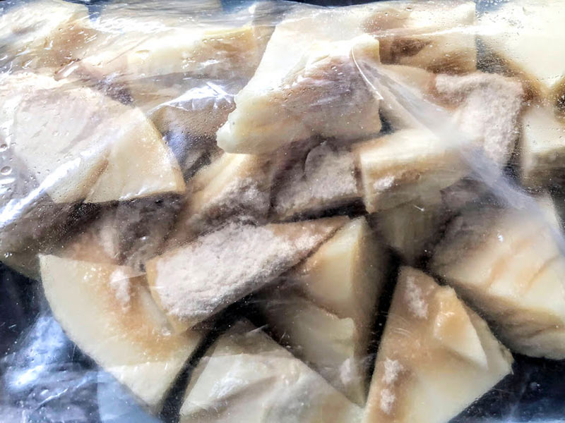 ジッパー付きの保存袋にたけのこを入れて、まんべんなく砂糖をまぶしてください。保存袋内の空気を抜いたら金属製のバットに置き、その上に保冷剤を載せて冷凍庫に入れます。
