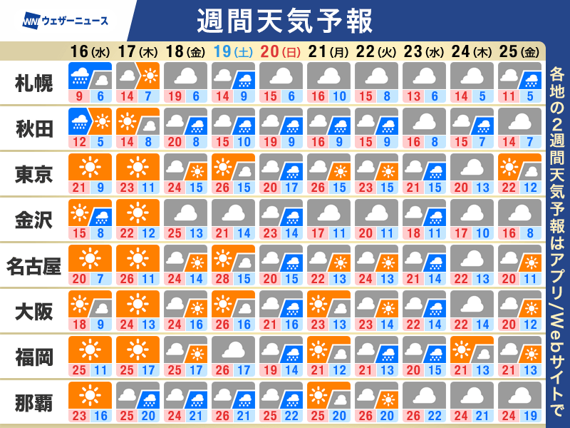 週後半になると寒気の影響が解消し、さらに、週末に通過する低気圧が暖かい空気を引き込むことで気温が高めになる見通しです。東京や名古屋、大阪など25℃以上の夏日となる予想のところが多くなります。日々の気温変化が大きくなりますので体調管理にお気をつけください。