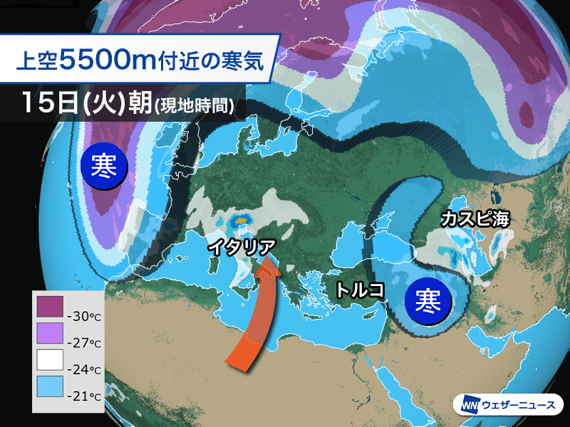 また、トルコ付近にも寒気の南下がみられ、上空の流れから切り離された「寒冷渦」となってカスピ海方面に進んでいる状況です。こちらも雨雲が発達し、トルコ東部からアゼルバイジャンなどで雨が強まっています。