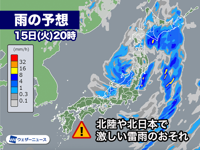 今夜にかけては北陸や東北で激しい雷雨となるおそれがあります。大気の状態が不安定なため、落雷や突風、降雹にも注意が必要です。屋外では天気の急変にお気をつけください。