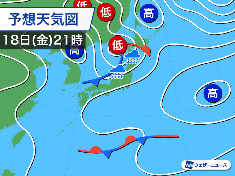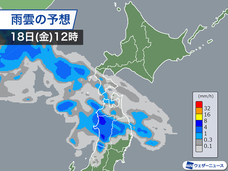 明日18日(金)は東北北部や山形県で朝から雨が降り、午後は東北北部太平洋側や北海道でもだんだんと雨が降り出してきます。