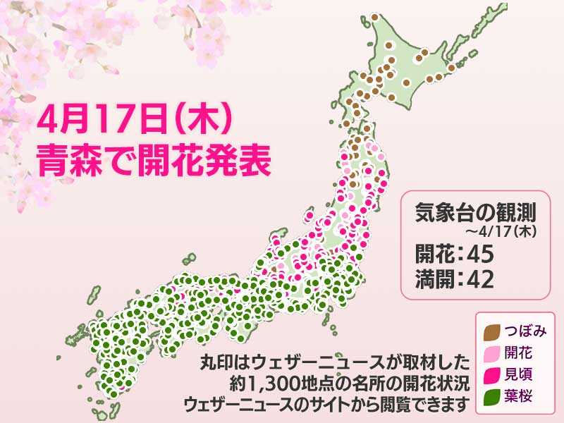 今日の桜開花状況 4月17日(木) 青森で開花発表 残るは北海道のみ