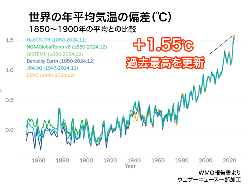 2024年の世界平均気温は1.55℃上昇を記録しましたが、エルニーニョ現象などの影響が重なった一時的な上振れと考えられます。しかし、平均的に見ても1.3℃上昇に達しており、これがさらに長期的に上がり続けているのです」(江守さん)