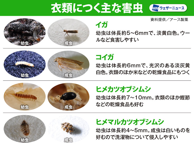 「家庭での主な衣類害虫は、イガ、コイガ、ヒメカツオブシムシ、ヒメマルカツオブシムシの4種です」(アース製薬)