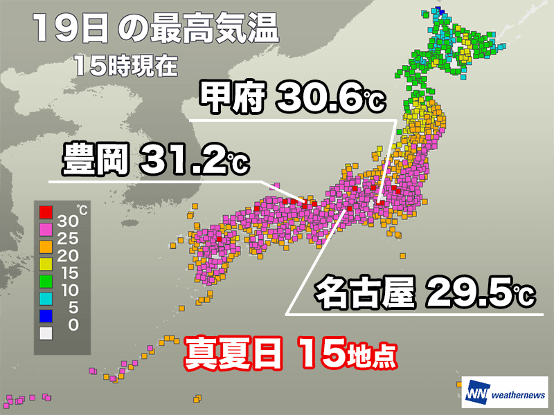 15時までの最高気温は全国で最も高い兵庫県豊岡市で31.2℃まで上昇。そのほか、甲府市で30.6℃、鳥取市で30.4℃、群馬県館林市で30.3℃など15地点が30℃以上の真夏日です。