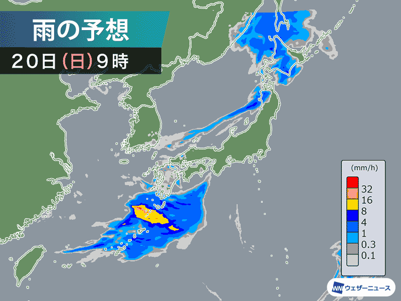 九州南部は朝に本降りの雨となり、奄美や沖縄では一時強く降る所がある予想です。落雷や突風にも注意してください。