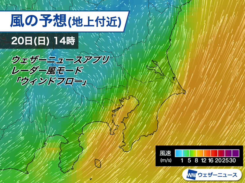 日本の東の海上にある高気圧と、北日本を進む低気圧の気圧差が大きくなり、関東は東京湾周辺で南西の風が強まっています。羽田空港では平均風速が10m/sを超えることもある状況です。東京都、神奈川県、千葉県の一部には強風注意報が発表されています。