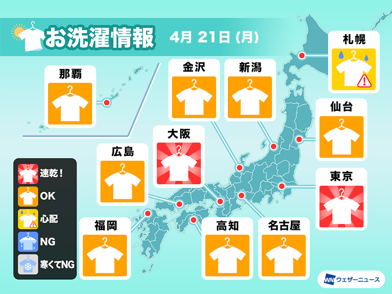 ただ、北海道は今日も雲の多い一日で、雨や雪の降るところがありそうです。沖縄や奄美も曇り空が続き、外干しは油断できません。