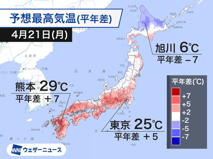 一方で、北日本の上空には寒気が南下します。特に北海道では北寄りの風も吹いて、昨日より気温の下がるところが多くなる見込みです。旭川では6℃、網走では4℃までしか上がらない予想で、3月下旬並みの気温となるとみています。昼間も上着が必要な寒さになりますので、体調管理をしっかりと行うようにしてください。