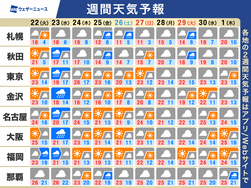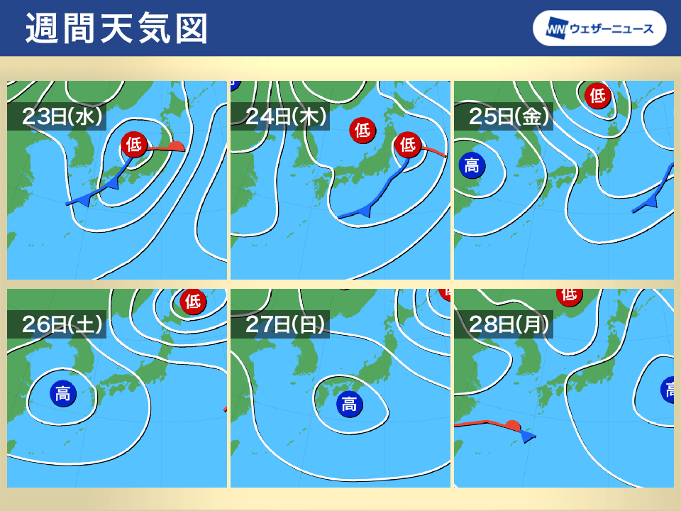 明日22日(火)は前線を伴った低気圧が大陸から進んでくるため、西からゆっくりと天気が下り坂に向かいます。九州では午後から雨が降り出し、夜にかけて雨の範囲は中国四国や近畿へと拡大する見込みです。23日(水)には東日本や北日本を中心に雨になります。