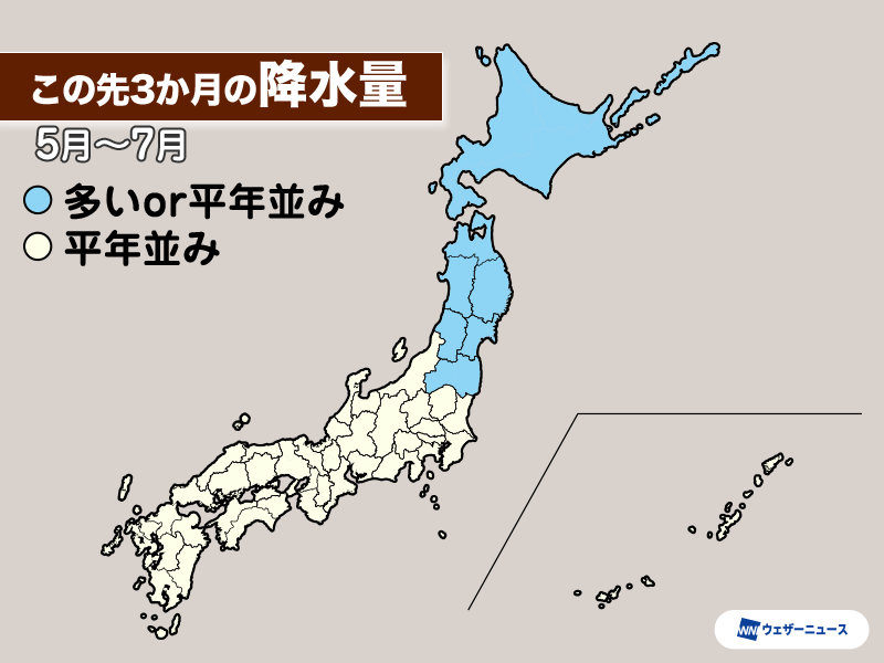 3か月間の降水量予想は北日本で平年並みか平年より多く、西日本・東日本や南西諸島では平年並みとなっています。