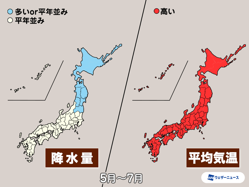 これらの要因により、3か月の平均気温は平年を上回る予想です。特に6月と7月の気温は平年を上回る可能性が高く、猛暑レベルの厳しい暑さとなるおそれがあります。