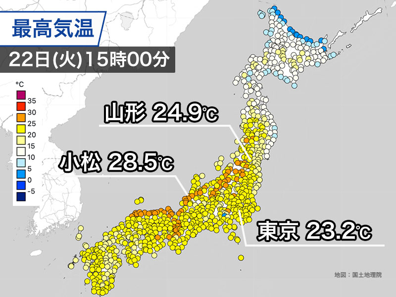 石川県小松のアメダスは28.5℃を観測して、島しょ部を除いて最も気温が高くなりました。