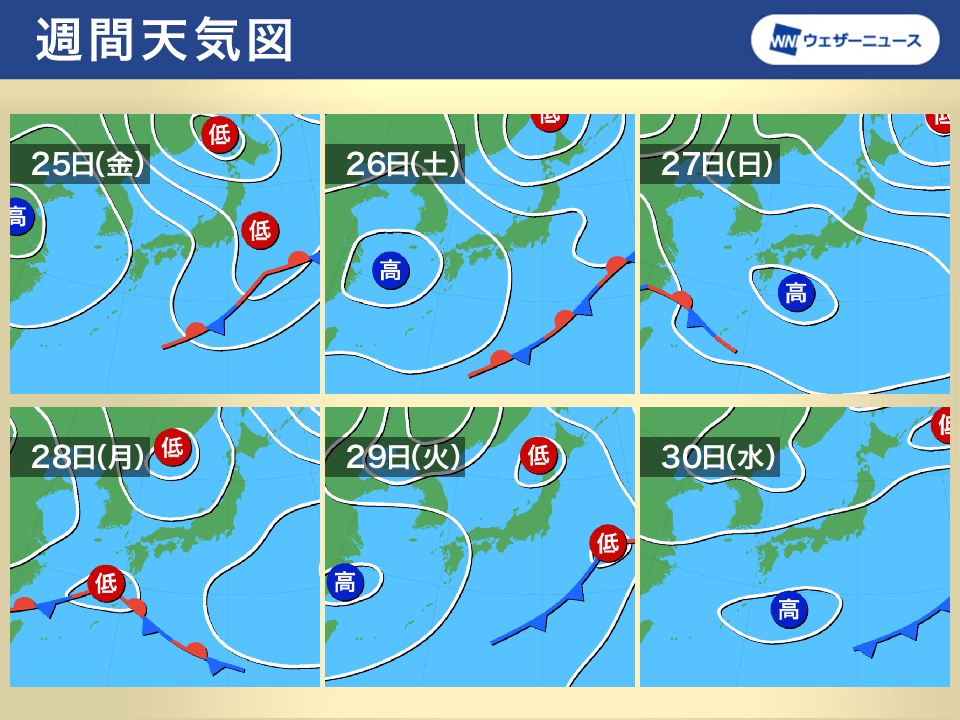 ただ、26日(土)になると上空に寒気が流れ込み、各地で平年並みか、平年よりもやや低くなる予想です。