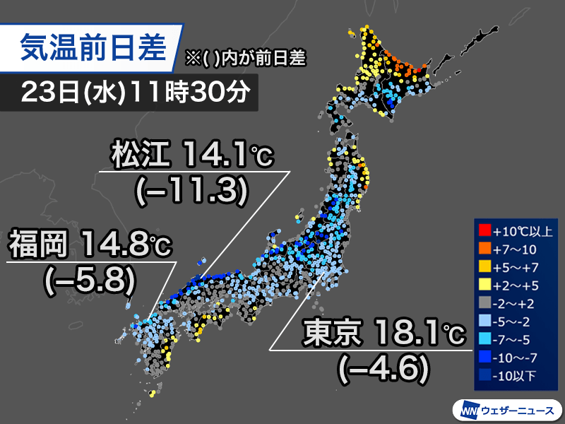 関東や東海、東北なども昨日よりも低く、東京都心は昨日より4.6℃低い18.1℃、仙台市は1.6℃低い12.6℃です。