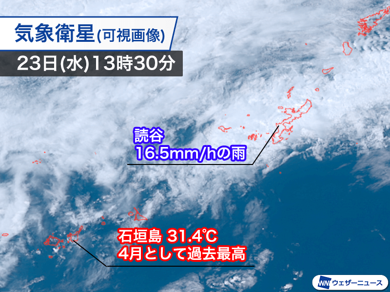 一方で、前線から少し離れている先島諸島は晴れ間が出ている上、暖かな空気が流れ込んでいることで気温が上がっています。石垣島では12時24分に31.4℃まで上昇。これは昨年4月29日に観測した31.1℃を上回る、4月として過去最高の気温です。