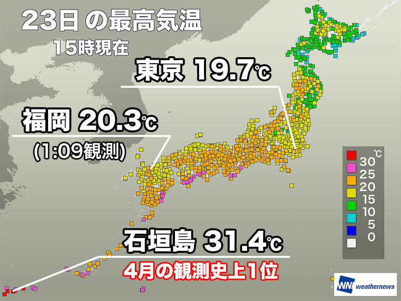 沖縄は前線から離れている先島諸島で日差しが届き、30℃以上の真夏日になった所があります。石垣島は31.4℃を観測し、4月としての過去最高気温を更新しました。