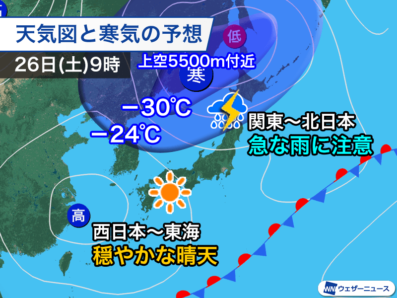 関東は寒気が南下することで、シアーライン(風の流れが変化する境界線)付近で雲が発達し、にわか雨の可能性があります。