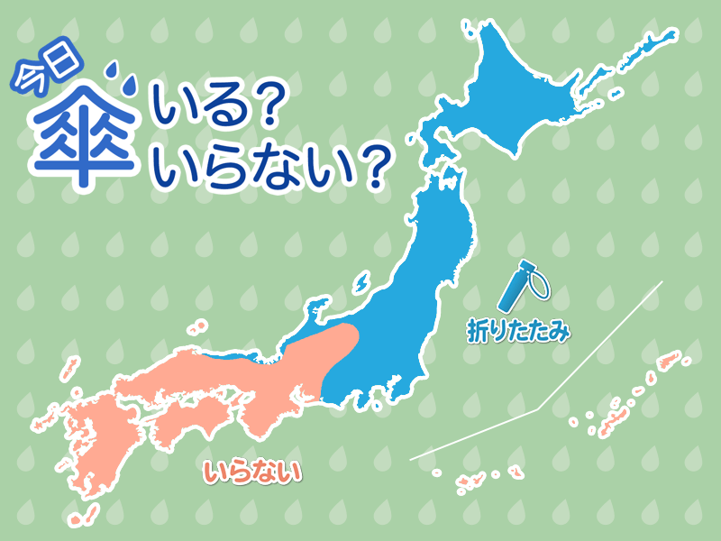 北海道は天気が下り坂で、太平洋側では雨が降りやすいので、折りたたみ傘を忘れずに。日本海側やオホーツク海側も午後は遅い時間ほど雨が降りやすくなるので、帰り道に備えて、折りたたみ傘があると安心です。