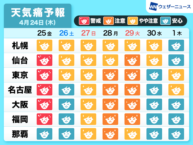 その後は来週前半に関東沖を低気圧が通過する予想で、そのタイミングで広範囲で注意ランクとなっており個人差はあるものの頭痛や関節痛などの天気痛の症状が出る可能性があります。痛みや身体の不調がひどくなる前に早めに対策を行ってください。
