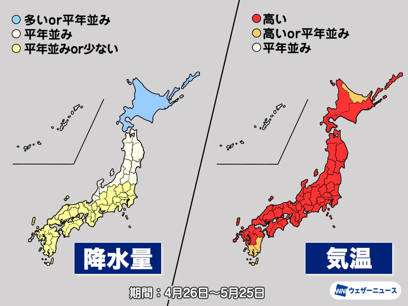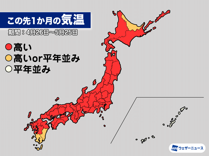 1か月の平均気温は全国的に高めの傾向で、九州北部から東北、北海道の太平洋側と日本海側は平年より高い予想です。九州南部と北海道オホーツク海側は平年並みか高くなるとみられます。