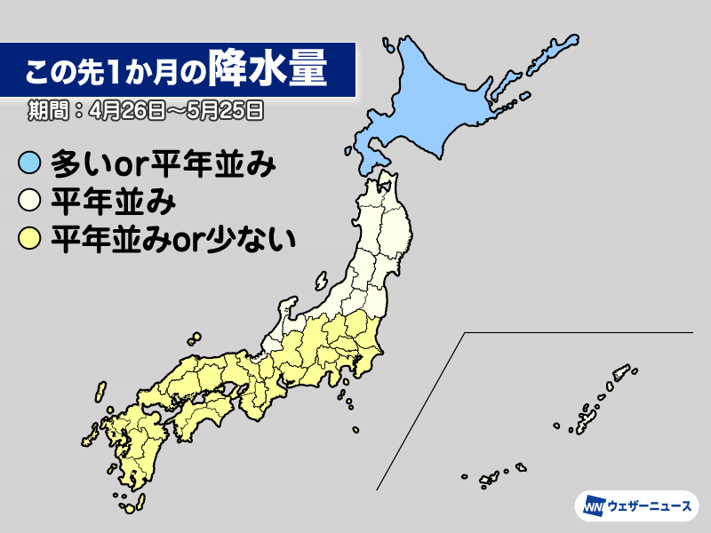 関東甲信や東海、西日本は高気圧に覆われて晴れる日が多く、降水量は平年並みか平年よりも少ない見通しです。