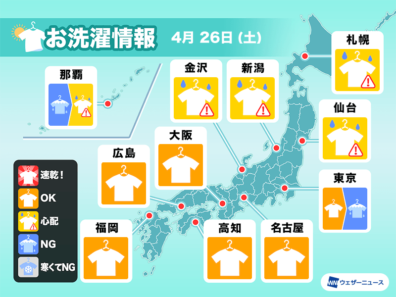 ゴールデンウィーク初日は、九州から東海で晴れて洗濯物の外干し日和です。冬物のしまい洗いを進めるにもピッタリです。
