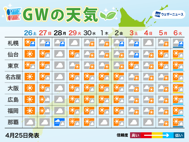 GW前半は西日本や東日本を中心に快適な陽気の所が多くなります。北日本は寒気の影響を受けるため、少し肌寒い日がありそうです。