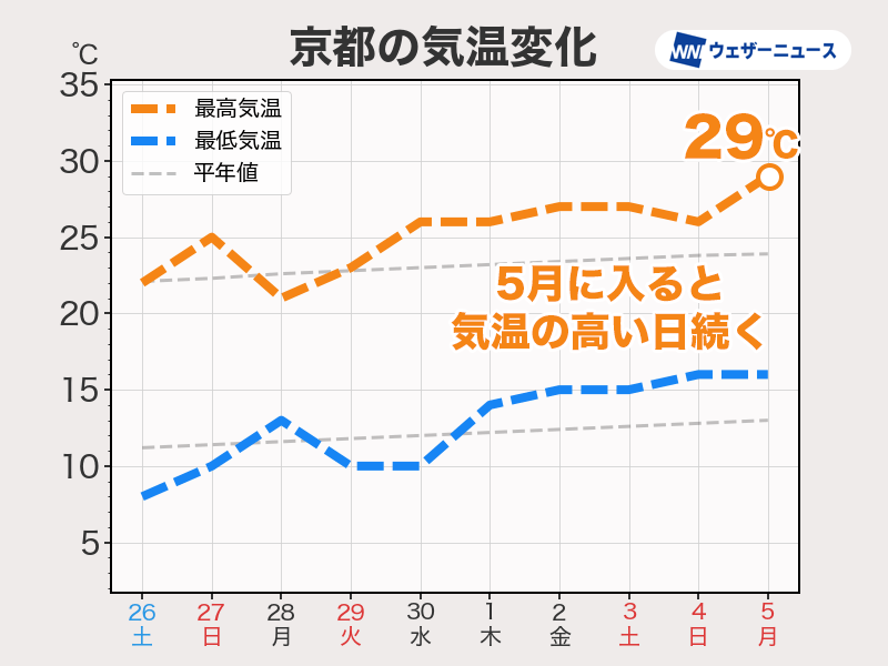 京都市の最高気温は連日25℃以上で、5日(月)は29℃まで上がる見込みです。夏を思わせるような暑さとなります。