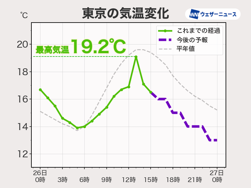 朝から雲が広がった関東エリアでは気温の上昇が鈍く、東京の最高気温は19.2℃でした。