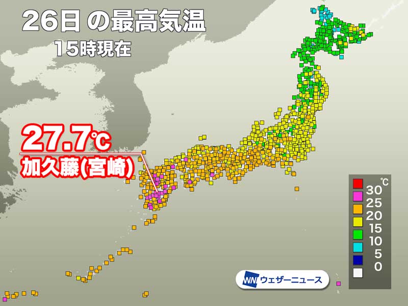 15時までに25℃以上の最高気温を観測した地点数は21地点。最も高い最高気温は宮崎県加久藤の27.7℃でした。九州や四国を中心に夏日となった地点が分布しています。
