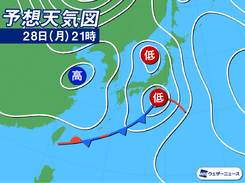 日本列島の南岸を進む低気圧とは別に、日本海にも低気圧があり東に進んでいます。このため、北日本や日本海側では午後は雨の降り出すところがある見込みです。