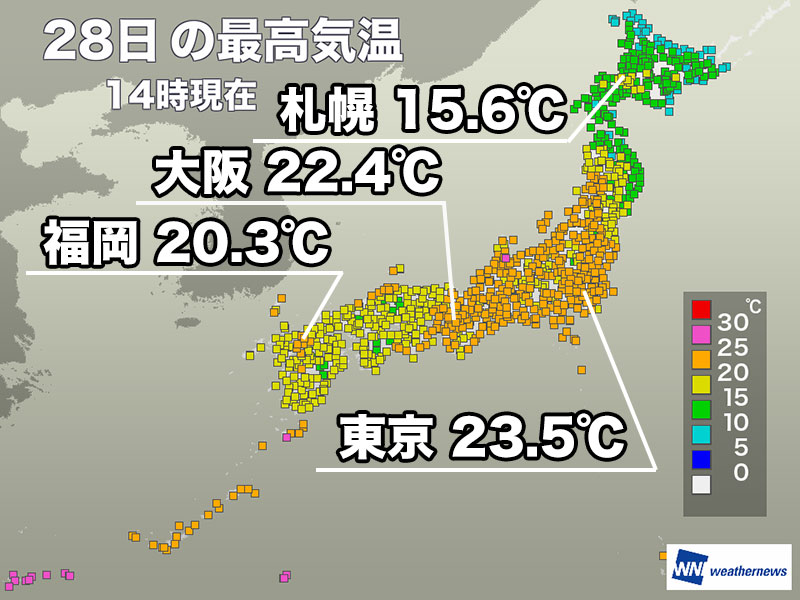 今日28日(月)14時までの最高気温は、福岡20.3℃、広島は未明に観測した19.6℃、大阪22.4℃でした。西日本は昨日より5℃くらい低いところが多くなりました。雨が降り出すとさらに気温が下がる傾向となり、暑さは和らいでいます。