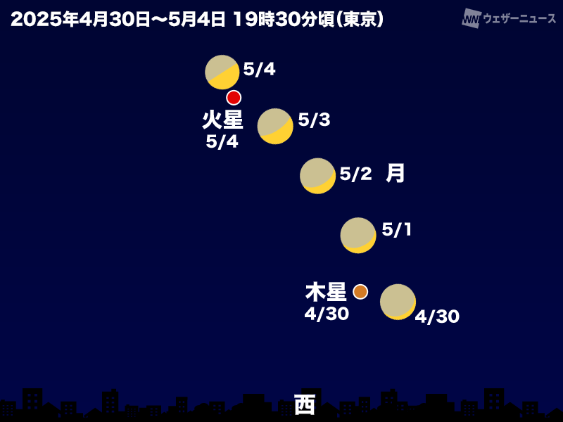 5月頭には木星よりも低い位置で土星が輝きますが、5日(月)頃には金星に並び、その後は金星よりも高い位置で見られるようになります。