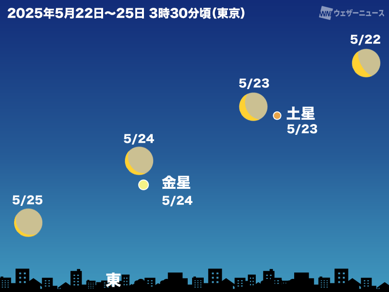 23日(金)の未明から明け方には細い月が土星に近づき、24日(土)の未明から明け方には木星に近づくため注目です。