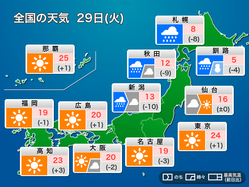 日本海側を中心に昨日よりも大幅に気温が下がり、寒く感じそうです。